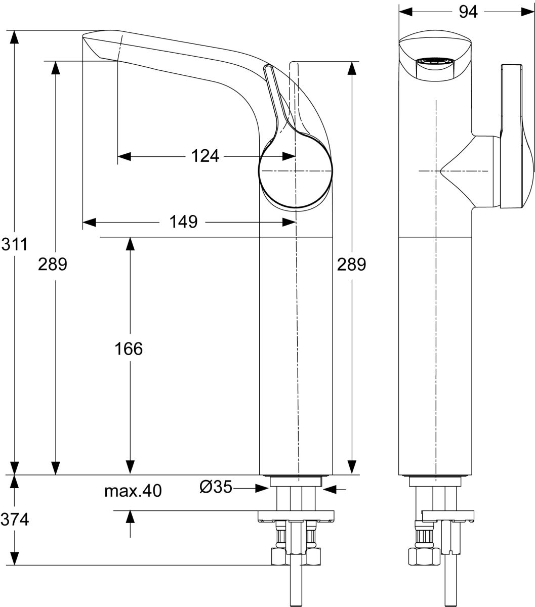 Melange umývadlová batéria s vysokým vývodom, bez odpadovej garnitúry a flexibilnými hadicami. Pevný vývod a sktytý perlátor. Vývod 124 cm. Výška vývodu 289mm. Kovová ovládacia páka. Montáž zo spodu Easy-Fix. Kartuša ø 40 mm s keramickými diskami. Rozsah otáčania páky 120°. Integrovaný zásobník maziva (vhodné pre potravinárské použitie). Integrovaný omedzovač teplej vody. Životnosť testová podľa EN 817. Ochrana proti hluku Din 4109, trieda 1.