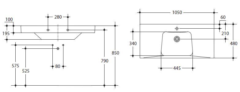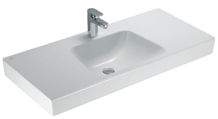 Imagine umývadlo z keramického črepu. V strede s 1 otvorom pre umývadlovú batériu, vľavo a vpravo otvory predpichnuté. Systém skrytého prepadu, vrátane odpadového ventilu s integrovaným prepadom Ideal Flow N 8326 AA. Umývadlo možno inštalovať na stenu alebo s kúpeľňovým nábytkom.