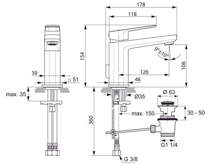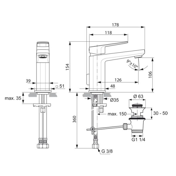 Tonic II umývadlová batéria s odpadovou garnitúrou a flexibilnými hadicami. Nastaviteľný perlátor a sklon prúdu vody. Obmezovač prietoku bez závislosti na tlaku vody(5L/min). Easy-Fix upevnenie. Odpadová garnitúra kovová.