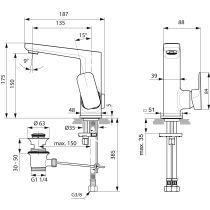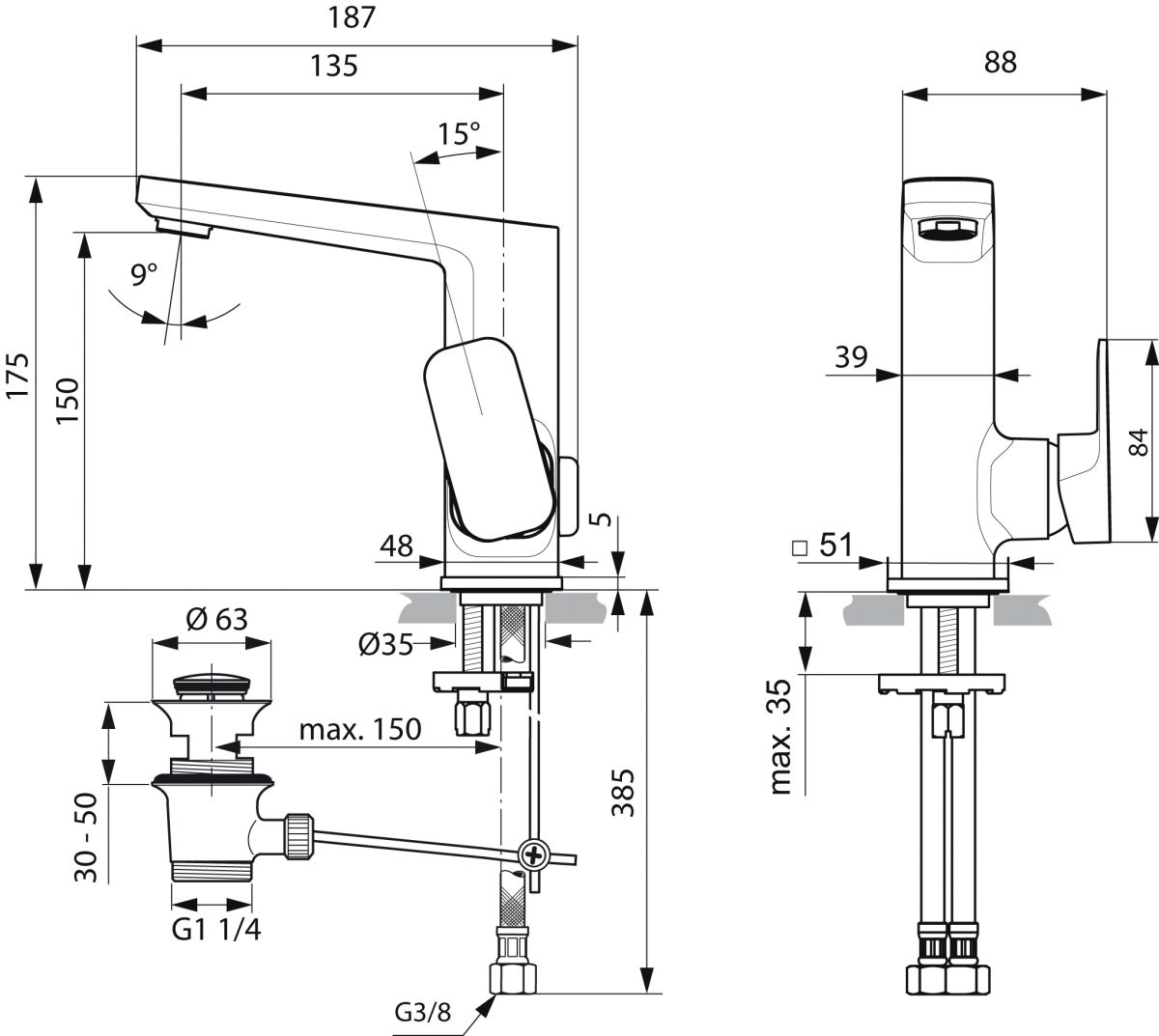 Tonic II umývadlová batéria s vysokým vývodom s odpadovou garnitúrou a flexibilnými hadicami. Ovládacia páka na strane. Nastaviteľný perlátor a sklon prúdu vody. Obmezovač prietoku bez závislosti na tlaku vody(5L/min). Easy-Fix upevnenie. Odpadová garnitúra kovová.