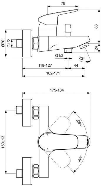 Ceraflex vaňová batéria nástenná DN 15. CLICK - technologie. So zariadením na zamedzenie spätného toku. Vývod 162- 171 mm. Skryté S-prípojky s nízkou hlučnosťou (nastaviteľné od 137-163 mm). Kovová ovládacia páka. Automatický prepínač zo sprchy do vane. Kartuša HWTC Ø 40 mm s keramickými diskami. Pivot kartuše z nerezovej ocele. Rozsah otáčania páky 120°. Integrovaný zásobnik maziva (vhodné pre potravinárske použitie). Integrovaný obmedzovač teplej vody plus ECO funkcia. Životnosť testovaná podľa EN 817. Ochrana proti hluku DIN 4109, trieda 1.