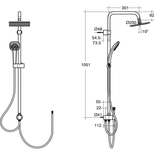 Idealrain Cube sprchový systém pre kombináciu s nástennou batériou alebo s dielom pre ripojenie sprchy. Kovová hlavová sprcha 200x200 mm a 3-funkčná ručná sprcha 100x100 mm (dášť / tropický dášť / masážný prúd). Funkcia Anti-Kalk - systém proti tvorbe vodného kameňa. Sprchová tyč s posuvným držiakom sprchy. Hadice "Idealflex" 1750 mm. Skryté pripojenie G1/2. Integrovaný prepínač.