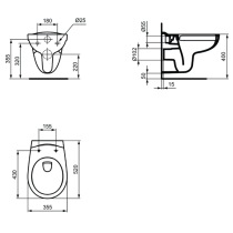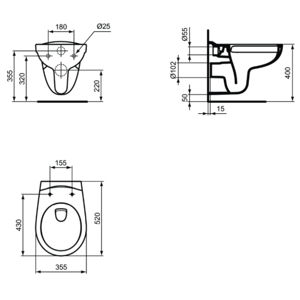 Eurovit WC závesné rimless 52x35 cm (bez kruhu) s hlbokým splachovaním zo zliateho keramického črepu. EN 997. Pre podomietkovú nádržku so splachovacou kapacitou od 4,5 L alebo pre podomietkový tlakový splachovač 3/4.