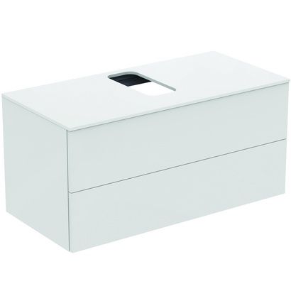 Adapto skrinka pod umývadlo s vrchnou doskou s výrezom u prostred pre kombináviu  s umývadlalmi Strada II, Cennect Cube, Connect Arc, Connect Sphere. 2 zásuvky s Puch-Pull otváracím mechanizmom. Vrátane upevňovacieho setu.