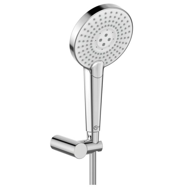 IdealRain Evo Jet circle sprchová sada EJC3,  3-funkčná circle ručná sprcha 12,5 cm (dážď, masážny prúd, peličková sprcha), Funkcia Anti-Kalk - systém proti tvorbe vodného kameňa. Sprchová sada s otočným držiakom ručnej sprchy. Hadica "Idealflex" 125 cm.