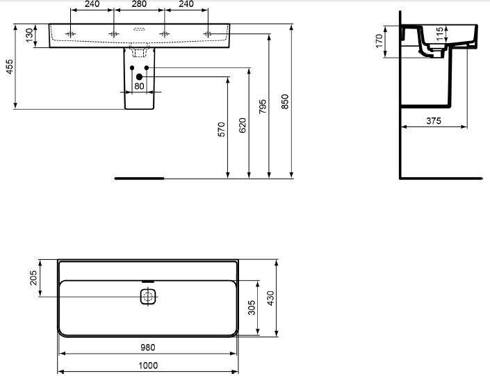 Strada II umývadlo 100x43 cm bez otvoru pre batériu. Umývadlo je dodávané vrátane  keramického krytu odpadu. Inštalácia na stenu. Upevnenie pomocou 4 skrutiek M10x140 mm. Kombinácia s polostĺpom, s nábytkovou konzolou alebo s designovým sifónom.