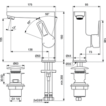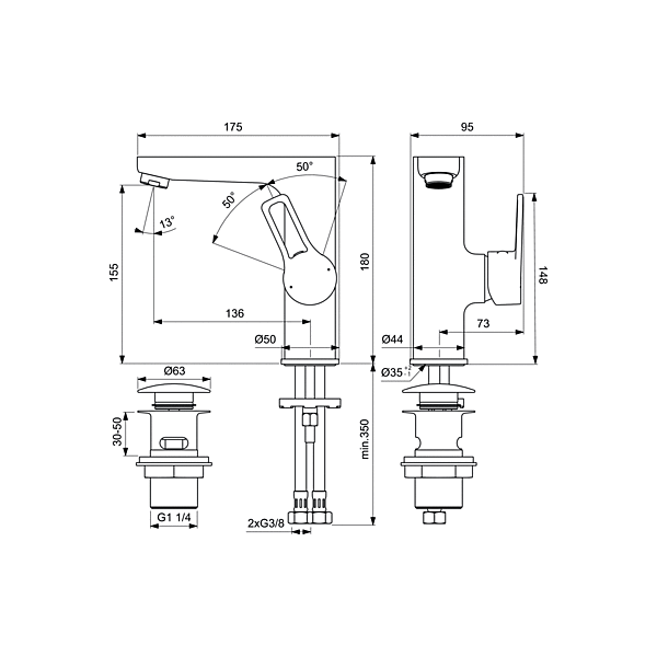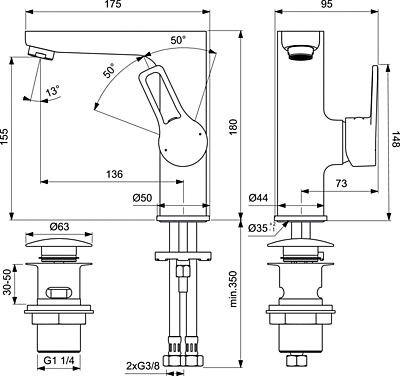 Sevatop umývadlová batéria vyvýšená s klik-klak garnitúrou a flexibilnými hadicami, 5 l/min. Ovládacia páka na strane. Obmezovač prietoku bez závislosti na tlaku vody(5L/min). Easy-Fix upevnenie.