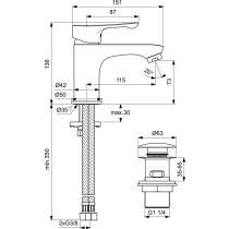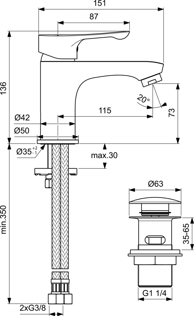 Alpha umývadlová batéria CLICK-CLACK s kovovou odtokovou garnitúrou G1 1/4. DN15. Tela batéria Ø42 mm s rozetou Ø50 mm. vývod 115 mm. Výška vývodu 73mm. S flexibilným hadičkami G3/8. Kovová ovládacia páka so značením teplá/studená zhora na ovládacej páke, chromová krytka. Montáž zo spodu upevnenie Easy FIX s centrovacím tesniacím krúžkom. Click Kartuša Ø35mm s keramickými diskamia obmedzovačom teplej vody. Pivot kartuše z nerez ocele. Životnosť testovaná podľa EN 817.