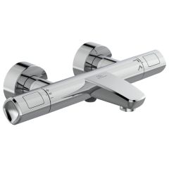 CeraTherm T25 vaňová nástenná termostatická batéria. DN 15. So zariadením na zamedzenie zpätného toku. Vývod 161 mm. Nová termostatická kartuša s vylepšenou technológiou nastavenia a kontroly teploty vody, regulácia teploty vody a ochrana proti obareniu. Štíhlejšie telo batérie Ø 41 mm so zdokonalenou technológiou CoolBody, vďaka nej telo termostatickej batérie zostane chladné po celom povrchu. Skryté S-prípojky s nízkou hlučnosťou (nastaviteľné od 137 - 163 mm). Funkcia AntiKalk - systém proti tvorbe vodného kameňa. Obmedzovač teplej vody - detská poistka. Pochromované plastové ovládacia rukoväte. Ergonometrické tlačítka, ktoré odráža design obládacej rukoväte - zkosenie. Prepínač zo sprcy do vane pomocou 2-cestného ventilu. Ľavá pre reguláciu teploty vody, pravá pre reguláciu prietoku. V súlade s EN 1111