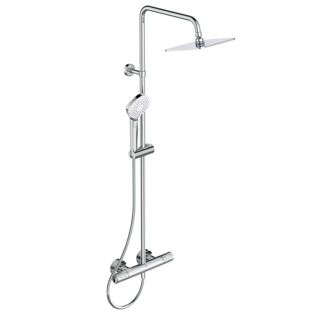 CeraTherm T100  sprchový systém s termostatickou batériou so sprchovou nástennou termostatickou batériou CeraTherm T100. DN 15. Nová termostatická kartuša s vylepšenou technológiou nastavenia a kontroly teploty vody, regulácia teploty vody a ochrana proti obareniu. Štíhlejšie telo batérie Ø 41 mm so zdokonalenou technológiou CoolBody, vďaka nej telo termostatickej batérie zostane chladné po celom povrchu. Skryté S-prípojky s nízkou hlučnosťou (nastaviteľné od 137 - 163 mm). Funkcia AntiKalk - systém proti tvorbe vodného kameňa. Kovová hlavová sprcha 200 x 200 mm a 3-funkčná hranatá ručná sprcha Evo Diamont  115mm (dášť / maážný prúd / jemný dážď). Funkcia Anti-Kalk (proti tvorbe vodného kameňa). Sprchová tyč s posuvným držiakom sprchy. Hadice "Idealflex" 1750 mm. Skryté pripojení G1/2. Obmedzovač teplej vody - detská poistka.Regulácia teploty s ochranou proti obareniu.  Kovové ovládacia rukoväte. Ľavá pre reguláciu prietoku i teploty vody, pravá so zabudovaným prepínačom, pre prepínania medzi vaňou a sprchou. V súlade s EN 1111