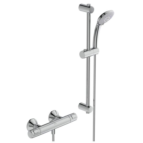 CeraTherm T25 sprchová nástenná termostatická batéria, so sprchovou kombináciou tyč 60 cm. CeraTherm T25 sprchová nástenná termostatická batéria. DN 15. So zariadením na zamedzenie zpätného toku. Nová termostatická kartuša s vylepšenou technológiou nastavenia a kontroly teploty vody, regulácia teploty vody a ochrana proti obareniu. Štíhlejšie telo batérie Ø 41 mm so zdokonalenou technológiou CoolBody, vďaka nej telo termostatickej batérie zostane chladné po celom povrchu. Skryté S-prípojky s nízkou hlučnosťou (nastaviteľné od 137 - 163 mm). Funkcia AntiKalk - systém proti tvorbe vodného kameňa. Obmedzovač teplej vody - detská poistka. Kovové ovládacia rukoväte. Ľavá pre reguláciu teploty vody, pravá pre reguláciu prietoku. 3- funkčná okrúla ručná sprcha IdealRain Ø100 mm (dážď, tropický dážď, masážny prúd) s funkciou Anti-Kalk systém proti tvorbe vodného kameňa. Sprchová tyč 60 cm s posuvným držiakom sprchy. Hadica IdealFlex 160 cm. Skryté pripojenie G1/2. V súlade s EN 1111