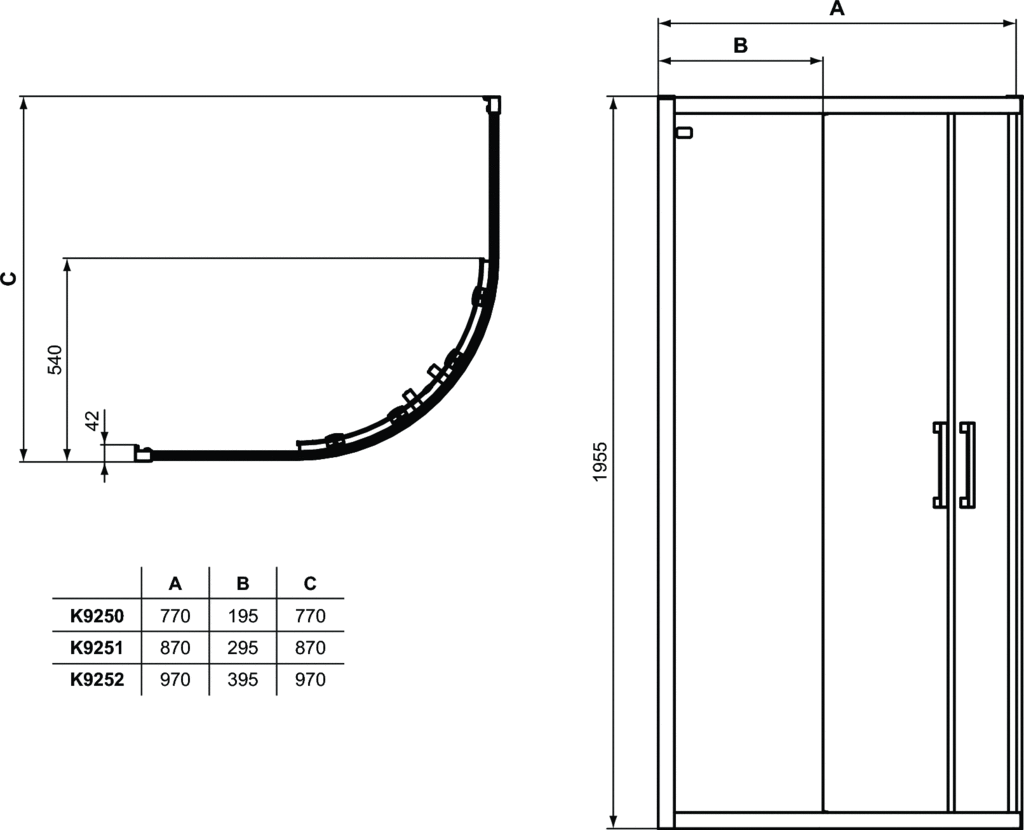 Connect 2 štvrťkruhový sprchovací kút s 2 posuvnými dverami. Rádius 550 mm. Výška 195 cm. Prevedenie výplne bezpečnostné sklo číre transparentné. Sklo s úpravou Ideal Clean (zamedzuje usadzovaniu vodného kameňa a uľahčuje čistenie). Hliníkové profily Silver Bright (lesklý chróm). Masívna chrómová rukoväť 225 mm. Hladké pojazdové kolieska.  Systém Clik&Clean (uvoľnenie spodnej častí dverí pre uľahčenie čistenia). Montážna nastaviteľnosť 25 mm na profil =  50 mm od 970mm - 995 mm. Možnosť kombinovať so všetkými sprchovými vaničkami, alebo inštalovať priamo na dlažbu. Dvere sú reversebilné - je možné ich inštalovať ako pravé i ľavé.  UPOZORNENIE: objednávacie číslo zahrňuje obe strany/obe dvere kúta (kompletné balenie). Kút je možné kombinovať len s pevnou stenou  Connect 2, ale iba ako tretia strana kúta.