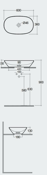 Variant umývadlo na dosku oválne 60x36 cm, bez otvoru pre batériu, a bez prepadového otvoru. Hrúbka hrany umývadla 5 mm.