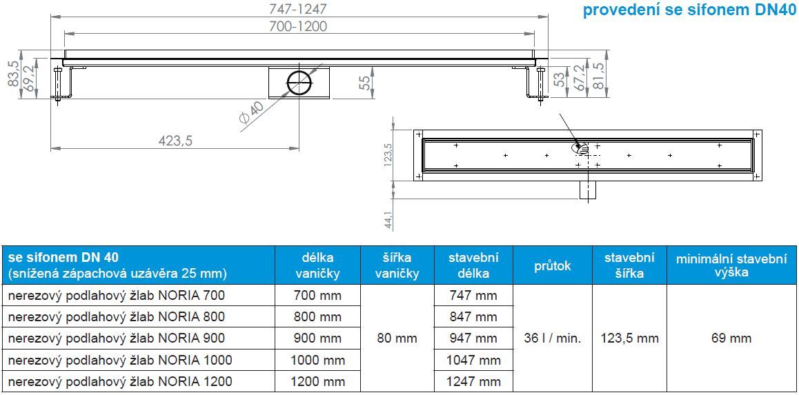 Noria žľab celonerezový 70 cm, DN40. Všetky komponenety sú vyrobené s nerezovej Oceľe 1.4301. Podesta 1,5 mm hrubá oceľ. Vanička 3 mm hrubá oceľ. Rošt 1,5 mm hrubá nerezová oceľ s povrchovým vyhotovením CLASSIC. Kompletná dodávka obsahuje nastaviteľné skrutky, rošt, nerezový sifón, hudroizolačnú pásku, kotviace skrutky, háčik pre demontáž mriežky a zapáchového uzáveru. Stavebná výška 69 mm pre DN40. Stavebná výška 110 mm pre DN40.  Pre dlažbu do 14 mm vrátane lepidla a hydroizolácie. Celková šírka vaničky 80 mm. Sifón je otočiteľný po 90° a prietok  je 36L/min. - DN40, 48L/min - DN50. Max. rozmer podesty 123,5 mm x M+47mm.