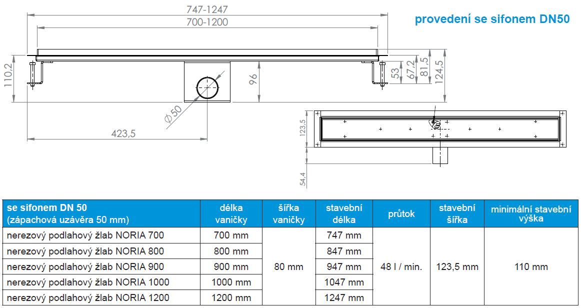 Noria žľab celonerezový 80 cm, DN50. Všetky komponenety sú vyrobené s nerezovej Oceľe 1.4301. Podesta 1,5 mm hrubá oceľ. Vanička 3 mm hrubá oceľ. Rošt 1,5 mm hrubá nerezová oceľ s povrchovým vyhotovením CLASSIC. Kompletná dodávka obsahuje nastaviteľné skrutky, rošt, nerezový sifón, hudroizolačnú pásku, kotviace skrutky, háčik pre demontáž mriežky a zapáchového uzáveru. Stavebná výška 69 mm pre DN40. Stavebná výška 110 mm pre DN40.  Pre dlažbu do 14 mm vrátane lepidla a hydroizolácie. Celková šírka vaničky 80 mm. Sifón je otočiteľný po 90° a prietok  je 36L/min. - DN40, 48L/min - DN50. Max. rozmer podesty 123,5 mm x M+47mm