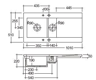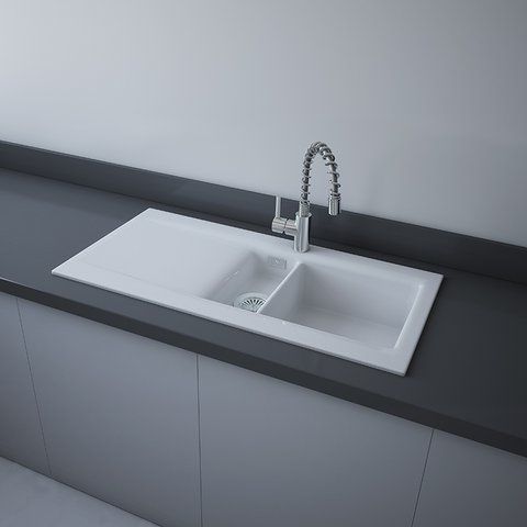 Keramický kuchynský dvojdrez, s odkladacou plochou vľavo, priemer odpadu 90 mm.