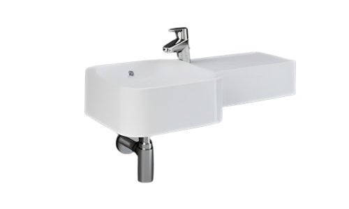 Umývadlo Petit s ukladcou plochou vpravo, s otvorom pre batériu. Možnosť skrinky v rôznych farbách.