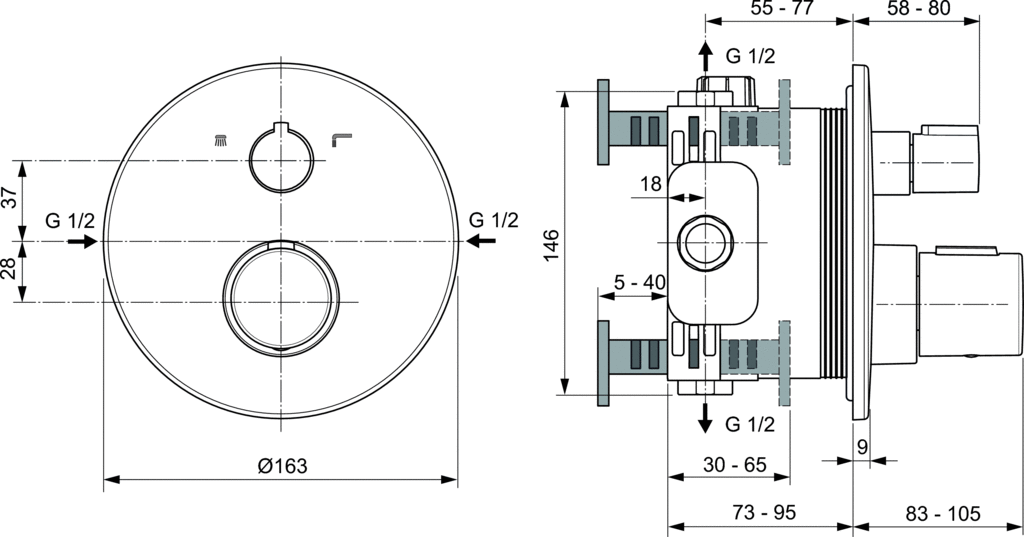 Ceratherm 100 sprchová termostatická podomietková batéria diel 2, Fail-Safe pre konečnú montáž. So zariadením na zamedzenie spätného toku. Kovová okrúhla rozeta D163mm, kovová rukoväť s bezpečnostným tlačítkom proti obareniu s prednastavením na 40°C. Funkcia Anti-Kalk. Prepínanie pomocou 2-cestného uzatváraciého ventilu. Termostatická kartuša s rozťažiteľnou voskovou súčiastkou. Tesniací systém DICHT-Fix samostatne tesnenie každého otvoru pre optimálnu ochranu proti vlhkosti a vode. Integrovaný obmedzovač teplej vody. Ochrana proti hluku DIN 4109, trieda1.