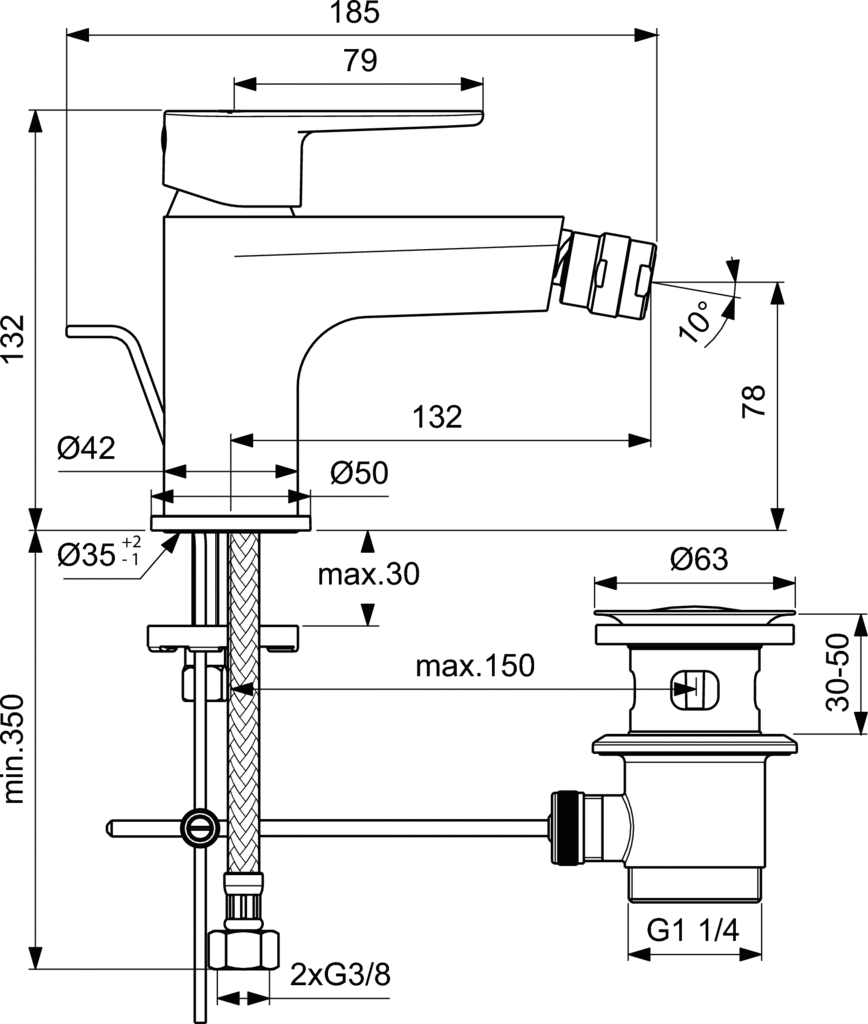 Cerafine O bidetová batéria s kovovou odtokovou garnitúrou G1 1/4. DN15. Liaty pevný vývod s nastaviteľným klbovým perlátorom. Obmedzovač prietoku bez závislost na tlaku vody 5//min. S flexibilným hadičkami G3/8. Kovová ovládacia páka so značením teplá/studená zhora na ovládacej páke, Montáž zo spodu upevnenie Easy FIX s centrovacím tesniacím krúžkom. Click Kartuša Ø28 mm s keramickými diskamia obmedzovačom teplej vody. Pivot kartuše z nerez ocele. Životnosť testovaná podľa EN 817.