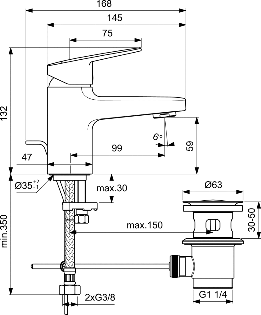 CeraPlan umývadlová batéria PICCOLO s kovovou odpadovou garnitúrou G1 1/4, DN 15. Pevný vývod, perlátor s prietokom 5L/min. Vývod 99 mm. Výška vývodu 59 mm. S flexibilnými hadicami G3/8. Kovová ovládacia páka s označením studená/teplá. Upevnenie EASY FIX- s centrovacím a tesniacím krúžkom - montáž zospodu . Kartuša Ø 38 mm s keramickými diskami a obmedzovačom teplej vody. Pivot kartuše z nerezovej ocele. Integrovaný obmedzovač teplej vody + ECO funkcia. Životnosť testovaná podľa EN 817. Ochrana proti hluku DIN 4109, trieda 1. Obmedzovač prietoku na max. 5 l/min pri pracovnom tlaku 0,3 MPa. Certifikát WELL A****.