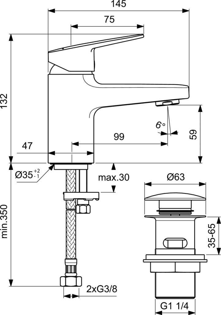 CeraPlan umývadlová batéria PICCOLO s Click-Clack garnitúrou G1 1/4,  DN 15. Pevný vývod, perlátor s prietokom 5L/min.  Vývod 99 mm. Výška vývodu 59 mm. S flexibilnými hadicami G3/8. Kovová ovládacia páka s označením studená/teplá. Upevnenie EASY FIX- s centrovacím a tesniacím krúžkom - montáž zospodu . Kartuša Ø 38 mm s keramickými diskami a obmedzovačom teplej vody. Pivot kartuše z nerezovej ocele. Integrovaný obmedzovač teplej vody + ECO funkcia. Životnosť testovaná podľa EN 817. Ochrana proti hluku DIN 4109, trieda 1. Obmedzovač prietoku na max. 5 l/min pri pracovnom tlaku 0,3 MPa. Certifikát WELL A****.