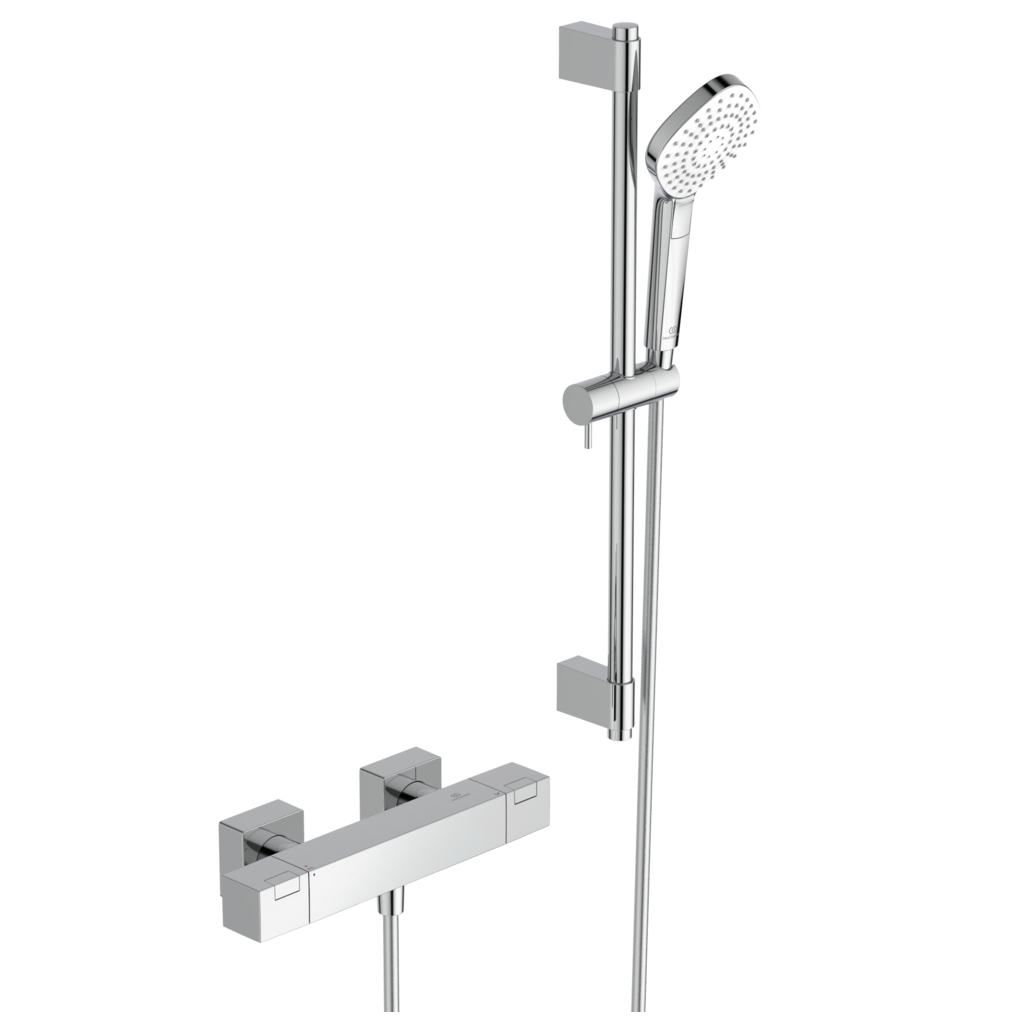 CeraTherm C100 sprchová termostatická batéria nástenná DN 15. So zariadením na zamedzenie spätného toku. Cool Body technológia. Skryté S-prípojky s nízkou hlučnosťou (nastaviteľné od 137 - 163 mm). Termostatická kartuša s rozťažiteľnou voskovou súčiastkou. Funkcia Anti-Kalk. Regulácia teploty s ochranou proti opareniu. Obmedzovač teploty (detská poistka). Blokovacie Eco tlačítko k obmedzeniu prietoku vody a keramické disky. Ochrana proti hluku DIN 4109, trieda 1. Sprchová kombinácia tyč 60 cm, 3-funkčná ručná sprcha Dimant 11x11 cm, držiak polohovateľný ručnej sprchy, hadica IdealFlex.