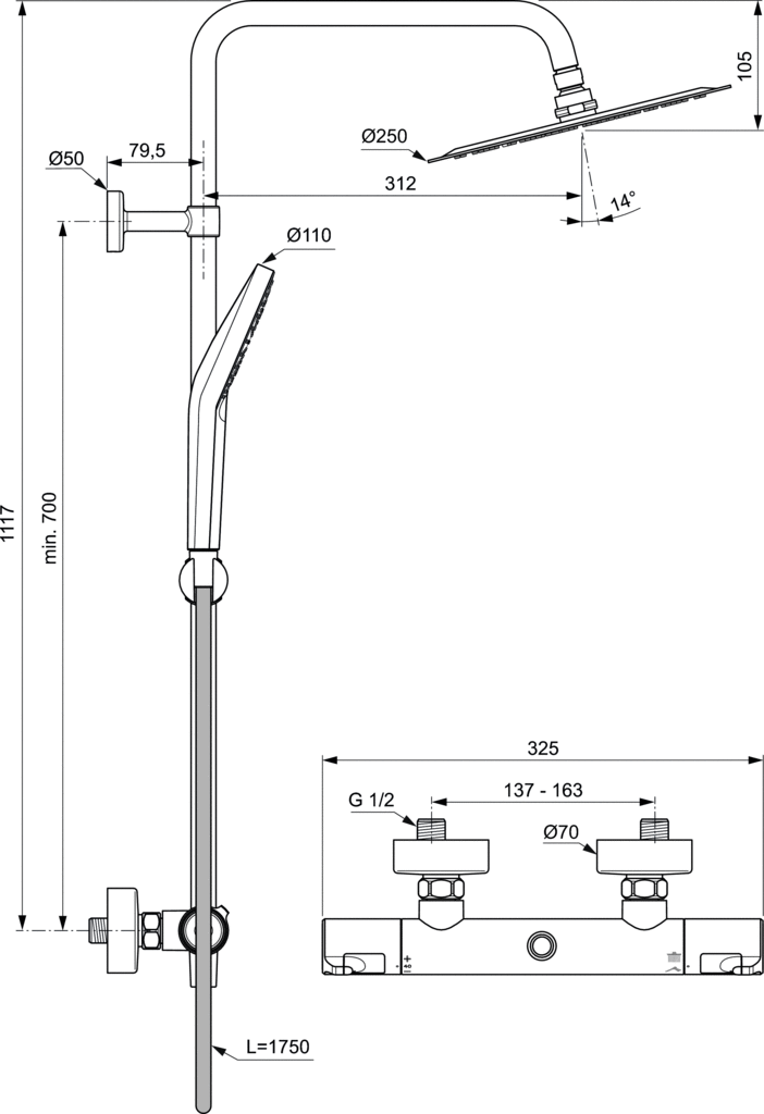CeraTherm T25 sprchový systém s termostatickou batériou so sprchovou nástennou termostatickou batériou CeraTherm T25. DN 15. Nová termostatická kartuša s vylepšenou technológiou nastavenia a kontroly teploty vody, regulácia teploty vody a ochrana proti obareniu. Štíhlejšie telo batérie Ø 41 mm so zdokonalenou technológiou CoolBody, vďaka nej telo termostatickej batérie zostane chladné po celom povrchu. Skryté S-prípojky s nízkou hlučnosťou (nastaviteľné od 137 - 163 mm). Funkcia AntiKalk - systém proti tvorbe vodného kameňa. Hlavová sprcha kovová Ultra tenká Ø250 mm a 3-funkčná okrúhla ručná sprcha IdealRain Ø100mm (dášť / tropický dášť / masážny). Funkcia Anti-Kalk (proti tvorbe vodného kameňa). Sprchová tyč s posuvným držiakom sprchy. Hadice "Idealflex" 1600 mm. Skryté pripojení G1/2. Obmedzovač teplej vody - detská poistka.Regulácia teploty s ochranou proti obareniu. Kovové ovládacia rukoväte. Ľavá pre reguláciu prietoku i teploty vody, pravá so zabudovaným prepínačom, pre prepínania medzi vaňou a sprchou. V súlade s EN 1111
