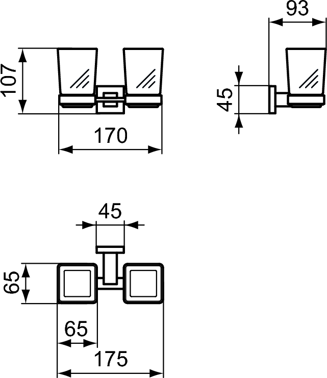 Iom sklenený dvojpohár s držiakom pripevnenie na stenu na zubnú kefku. Sklo matné. Držiak materiál kov - prevedenie chróm. Vrátene upevnenia.