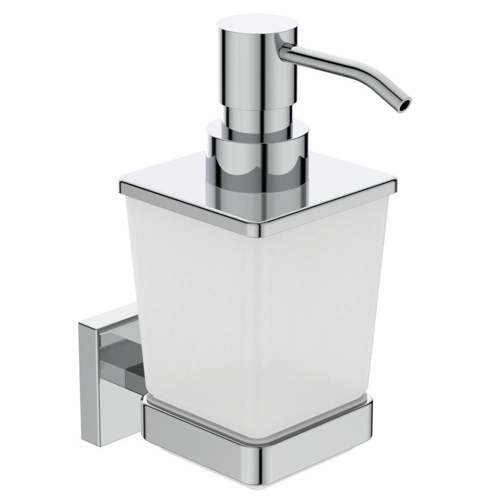 Iom dávkovač na tekuté mydlo vrátane upevňovacej sady. Materiál: miska (odnímateľná) - satinované sklo, držiak - kov prevedenie chróm. Funkčný dizajn pre jednoduchú montáž a údržbu.