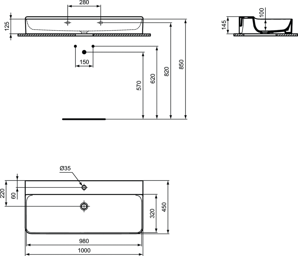 Umývadlo nástenné 100 x 45 cm farba biela lesklá s IdealPlus povrch.úpravou. S otvorom pre umývadlovú batériu. Bez prepadu. Brúsená spodná hrana (do roviny) - vhodné i pre inštaláciu na dosku. V prípade inštalácie s umývadlovou batériou s odtokovou garnitúrou je potrebné objednať predlžené tiahlo garnitúry.
