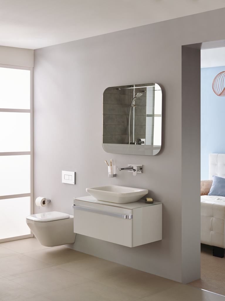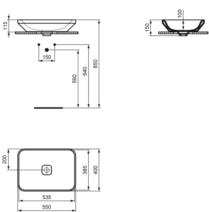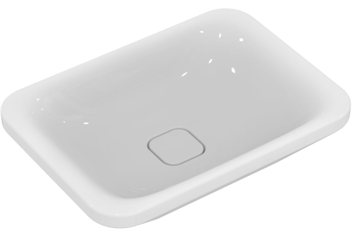 Tonic II umývadlo na dosku 55x40 cm symetrické bez otvoru pre batériu. Bez prepadu. Keramická krytka odpadu. Vrátane výrezovej šablóny a upevňovacej sady. Inštalácia v kombinácií s Tonic II skrinkou pod umývadlo alebo nábytkovou konzolou a sklenenou vrchnou doskou.