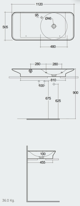 Rak Valet umývadlo 112x50,5 cm. S otvorom pre batériu a odkladacou plochou vľavo bez prepadového otvoru. Z keramického črepu prevedenie bielá matná. Umývadlo samonostné montáž na stenu, možnosť inštalácie na dosku, zadná stena neglazovaná.