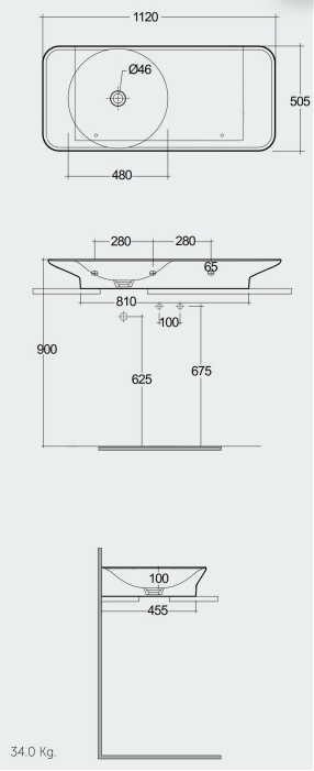 Rak Valet umývadlo 112x50,5 cm. Bez otvoru pre batériu a odkladacou plochou vpravo bez prepadového otvoru. Z keramického črepu prevedenie bielá lesklá. Umývadlo samonostné montáž na stenu, možnosť inštalácie na dosku, zadná stena neglazovaná.