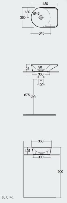 Rak Valet umývadlo 48x36 cm. Bez otvoru pre batériu a odkladacou plochou vpravo bez prepadového otvoru. Z keramického črepu prevedenie bielá matná. Umývadlo montáž na dosku.