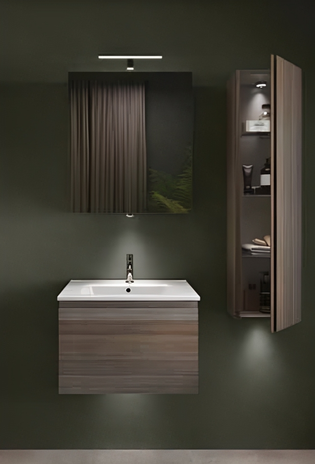 Rak Joy Uno skrinka 60x40 cm pod umývadlo bez hornej dosky, jednošuflík so spomaľujúcim dotváraním. Farebné prevedenie moka walnut melamín dýha. Vnútorný dekor skrinky - anthracite.