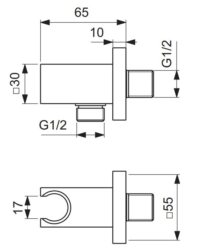 Držiak ručnej sprchy s prípojkou pre sprchu. Hranatý dizajn. Držiak je kovový s plastovou vložkou. G 1/2 pripojenie s ochranou proti spätnému toku. Technológia galvanického pokovovania - povrch chróm.