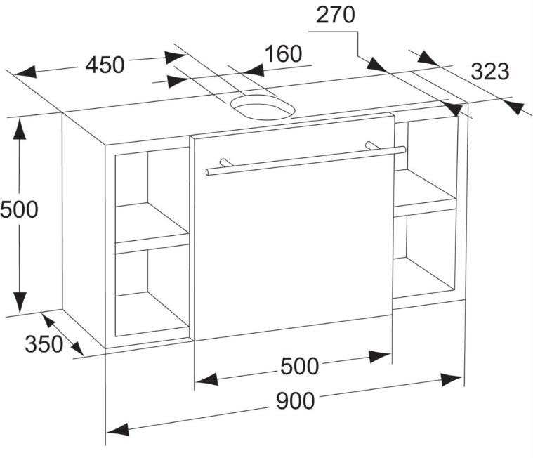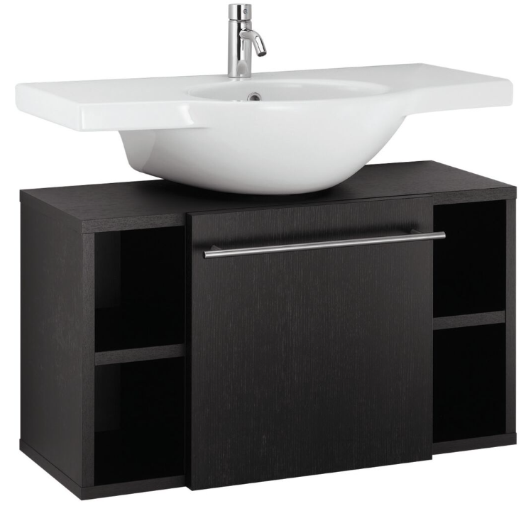 Small+ umývadlo 68x42,5 cm s odkladacími plochami, so skrinkou 90x35x50 cm s výsuvným kontajnerom a policami v ľavo a v pravo. Prevedenie povrvhu tmavá dýha - odtieň Wenge.