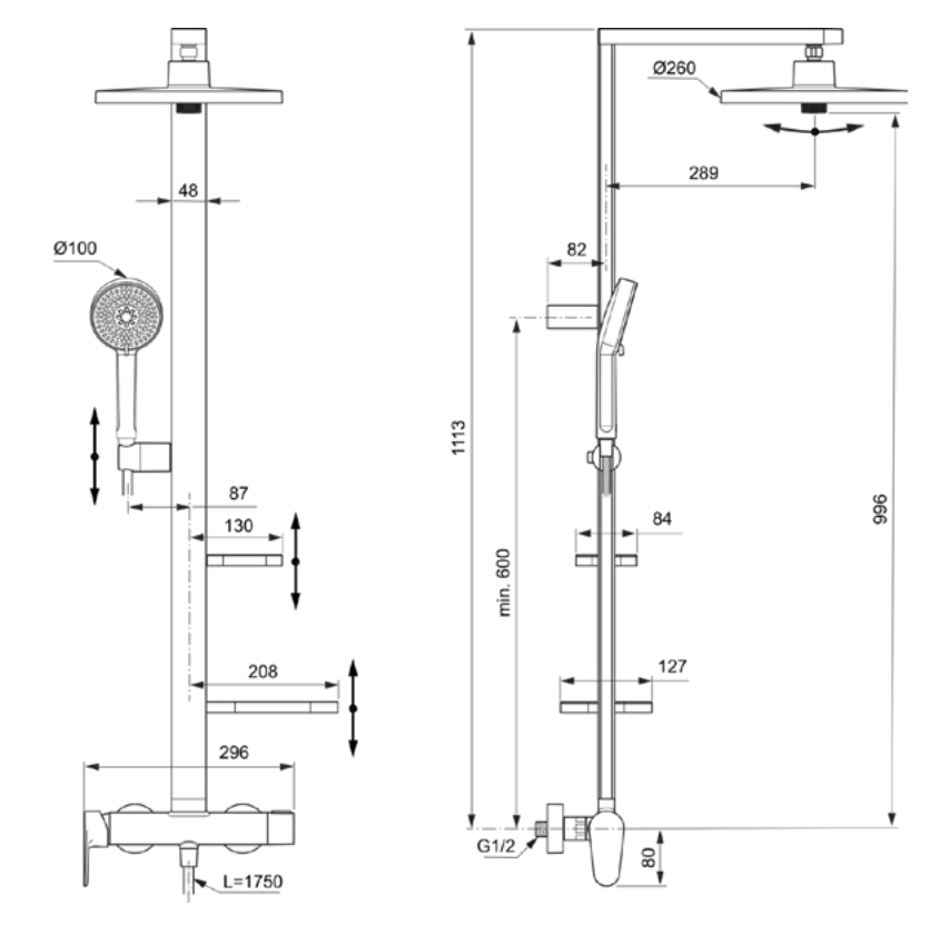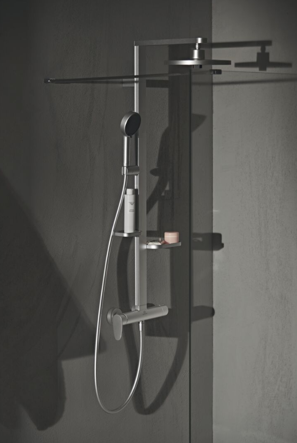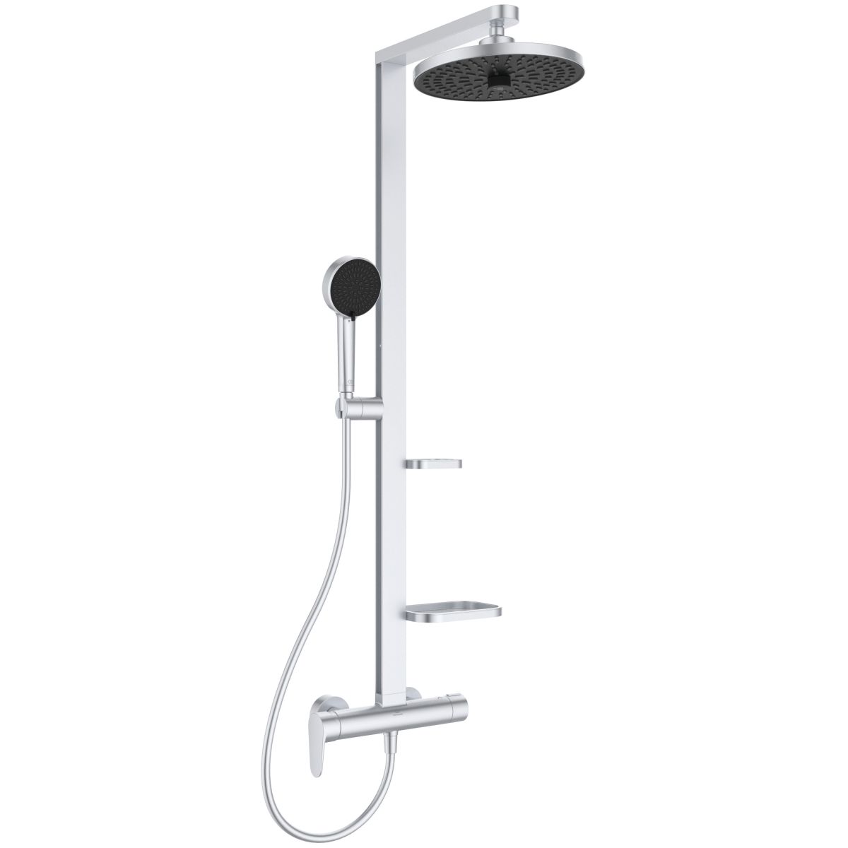 Sprchový systém sa skladá zo stúpajúcej tyče a profilov vľavo a vpravo pre umiestnenie držiaku a police podľa výberu pri prvej inštalácii. Držiak do profilu umožňujúci nastavenia uhlu ručnej sprchy. 2-funkčná hlavová sprcha 26 cm priemer s obmedzovačom prietoku vody 12l/min, 10 cm 2-funkčná ručná sprcha s obmedzovačom prietoku vody 8l/min, malá polička 13 cm/miska na mydlo (do 7 kg zaťaženia), veľká polička 20,8 cm (nosnosť 7 kg), sprchová hadica IdealFlex 175 cm.