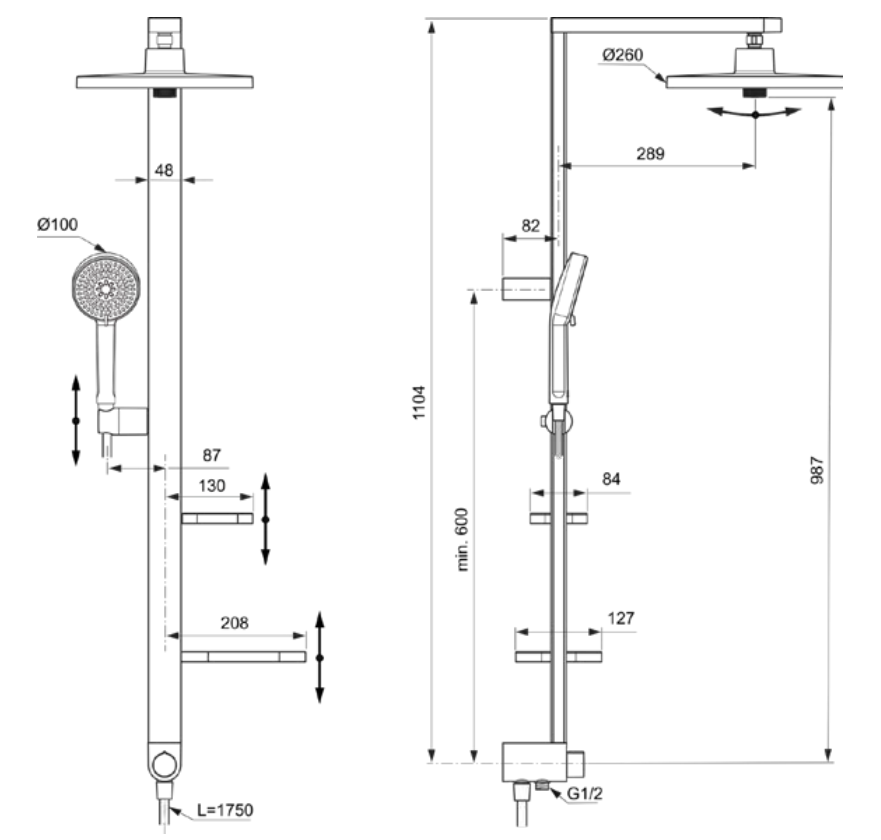 Sprchový systém sa skladá zo stúpajúcej tyče a profilov vľavo a vpravo pre umiestnenie držiaku a police podľa výberu pri prvej inštalácii. Držiak do profilu umožňujúci nastavenia uhlu ručnej sprchy. 2-funkčná hlavová sprcha 26 cm priemer s obmedzovačom prietoku vody 12l/min, 10 cm 2-funkčná ručná sprcha s obmedzovačom prietoku vody 8l/min, malá polička 13 cm/miska na mydlo (do 7 kg zaťaženia), veľká polička 20,8 cm (nosnosť 7 kg), sprchová hadica IdealFlex 175 cm pre spojenie s ručnou sprchou a sprchová hadica IdealFlex 80 cm pre spojenie so sprchovou batériou.