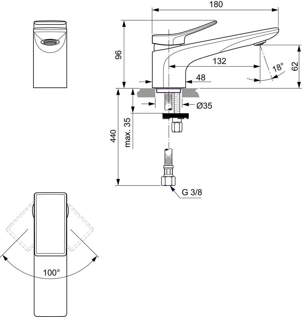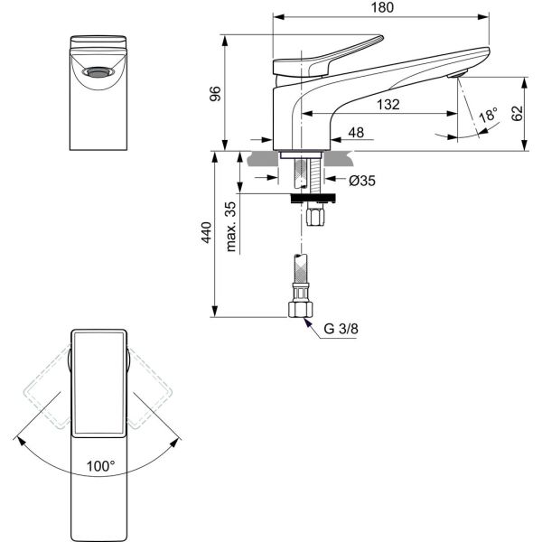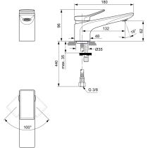 Conca umývadlová batéria, bez odpadovej garnitúry G1 1/4, DN 15. Pevný vývod, perlátor s prietokom 5L/min. S flexibilnými hadicami G3/8. Kovová ovládacia páka s označením studená/teplá. NOVÝ systém - EASY FIX + - montáž zospodu . Kartuša Ø 28 mm s keramickými diskami a obmedzovačom teplej vody bez click funkcie. Pivot kartuše z nerezovej ocele. Životnosť testovaná podľa EN 817. Ochrana proti hluku DIN 4109, trieda 1. Obmedzovač prietoku na max. 5 l/min pri pracovnom tlaku 0,3 MPa. Certifikát WELL A****.