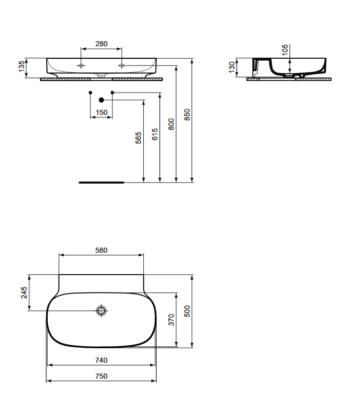 Linda-X umývadlo nástenné 75x50 cm, bez otvoru pre batériu. Brúsená spodná hrana - vhodné pre inštaláciu na dosku. Bez prepadu. Inštalácia iba so skrytým systémom prepadu IdealFlow, alebo neuzatvarateľnou odtokovou garnitúrou. potrebné doobjednať zvlášť.