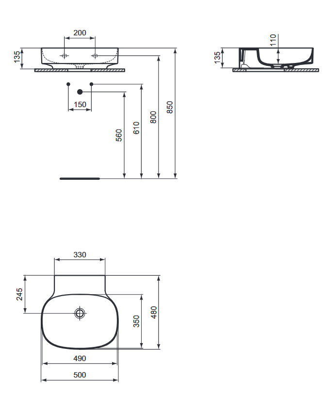Linda-X umývadlo nástenné 50x48 cm, bez otvoru pre batériu. Brúsená spodná hrana - vhodné pre inštaláciu na dosku. Bez prepadu. Inštalácia iba so skrytým systémom prepadu IdealFlow, alebo neuzatvarateľnou odtokovou garnitúrou. potrebné doobjednať zvlášť.