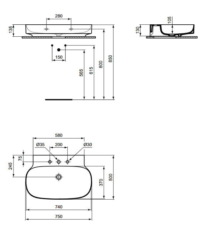 Linda-X umývadlo nástenné 75x50 cm, s 3 otvormi pre batériu. Brúsená spodná hrana - vhodné pre inštaláciu na dosku. Bez prepadu. Inštalácia iba so skrytým systémom prepadu IdealFlow, alebo neuzatvarateľnou odtokovou garnitúrou. potrebné doobjednať zvlášť.
