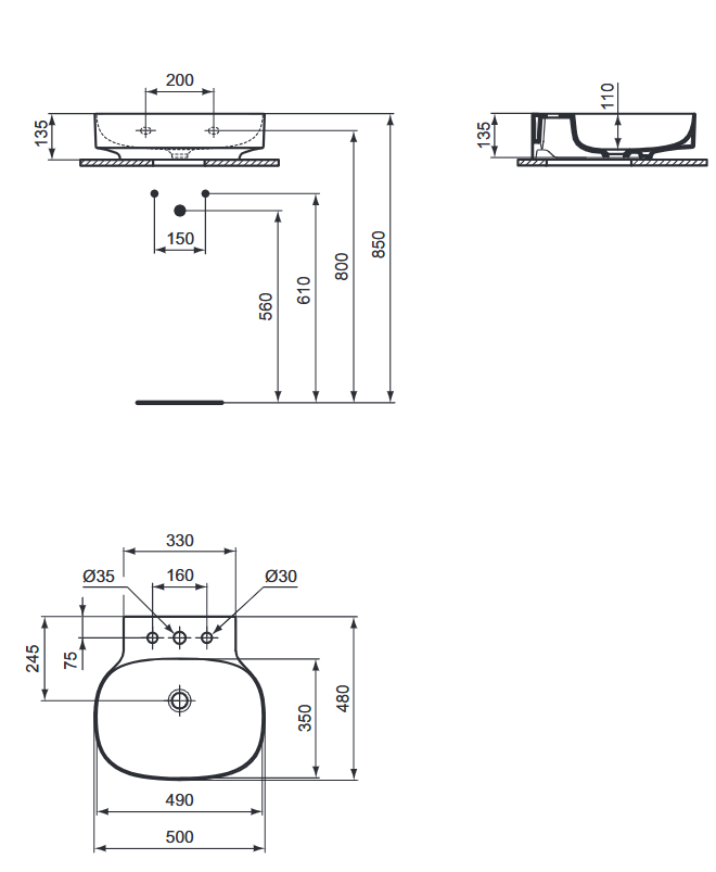 Linda-X umývadlo nástenné 50x48 cm, s 3 otvormi pre batériu. Brúsená spodná hrana -  vhodné pre inštaláciu na dosku. Bez prepadu. Inštalácia iba so skrytým systémom prepadu IdealFlow, alebo neuzatvarateľnou odtokovou garnitúrou. potrebné doobjednať zvlášť.