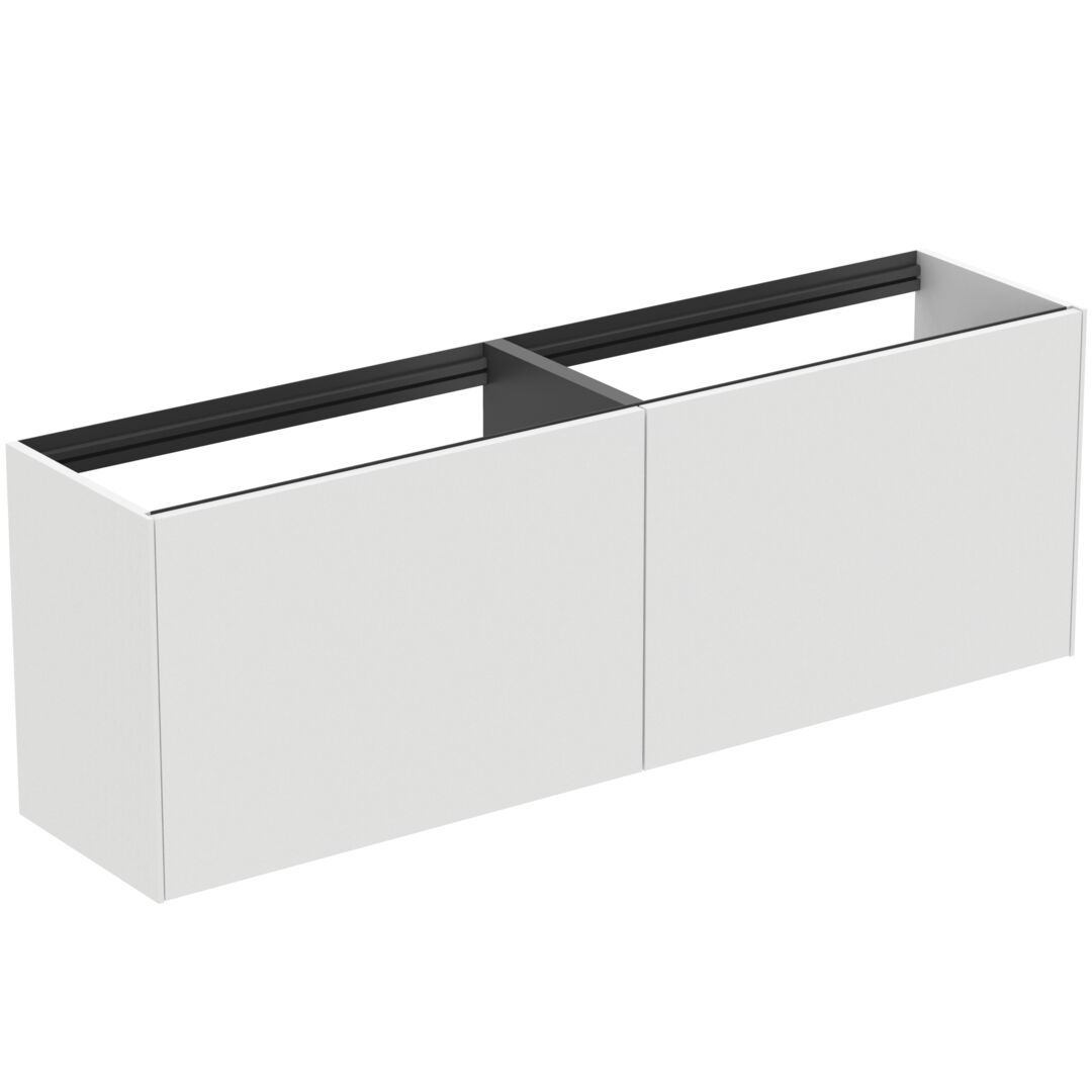 Conca umývadlová skrinka 160 cm farba Matná biela lakovaná, s krátkou šírkou 37 cm. 2xvonkajšie zásuvky a 2x vnútorné zásuvky. Bez hornej dosky. Kovanie na zásuvkách má kombinované funkcie Push-to-open a Soft-close. Vnútor skrinky antracitový povrch odpovedajúci farbe zásuvky. Kompatibilné s umývadlami Conca -brúsená spodná hrana.