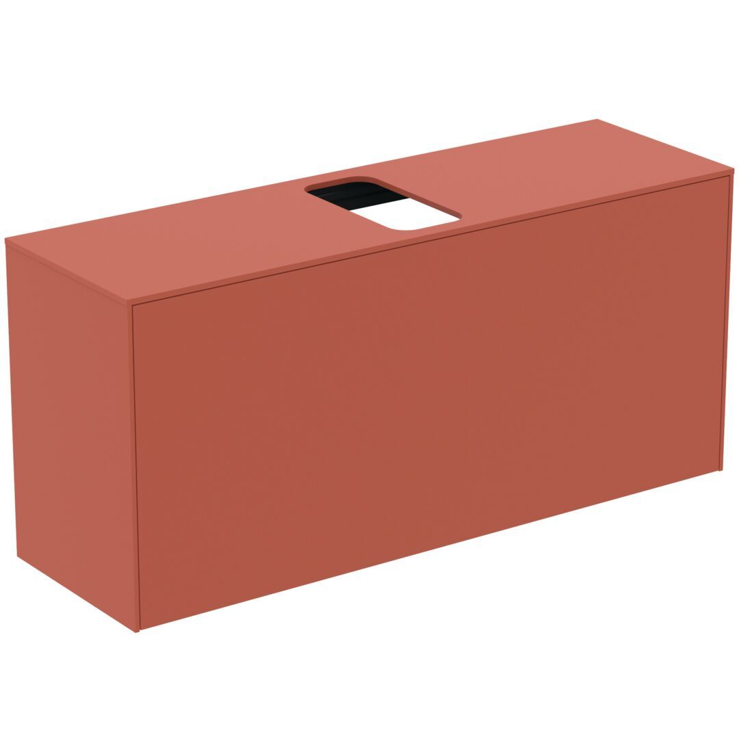 Conca umývadlová skrinka 120 cm farba Matný Sunset lakovaný, s krátkou šírkou 37 cm. 1x vonkajšia zásuvka a 1x vnútorná zásuvka. Horná doská s výrezom pre umývadla Conca a Exstra s brúsenou spodnou hranou.  Kovania na zásuvkách má kombinované funkcie Push-to-open a Soft-close. Vnútor skrinky antracitový povrch odpovedajúci farbe zásuvky. Kompatibilné s umývadlami Conca -brúsená spodná hrana.