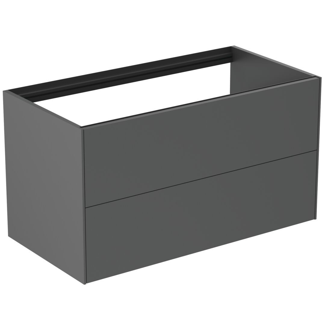 Conca umývadlová skrinka 100 cm farba Matný Antracit lakovaný, so šírkou 50,5 cm. 2x vonkajšia zásuvka . Bez hornej dosky. Keramická vrchná doskka (bez výrezu/ výrez na zakázku) musí byť objednaná na "Zakázkovom objednávkovom formulári", kde je špecifikovaná i kombinácia s vybraným umývadlom. Výrez prevádzajte podľa výrezovej šablony, ktorá je súčasťou balenia umývadla. Kovania na zásuvkách má kombinované funkcie Push-to-open a Soft-close. Vnútor skrinky antracitový povrch odpovedajúci farbe zásuvky. Kompatibilné s umývadlami Conca -brúsená spodná hrana.