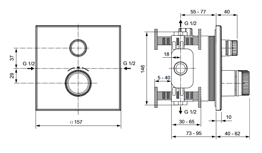 CeraTherm Navigo sprchová termostatická podomietková batéria diel 2, farba Hadvábne matná čierná, pre konečnú montáž. So zariadením na zamedzenie spätného toku. Kovová hranatá rozeta 157x157 mm, kovová rukoväť s bezpečnostným tlačítkom proti obareniu s prednastavením na 40°C. Termostatická kartuša s rozťažiteľnou voskovou súčiastkou. Tesniací systém DICHT-Fix samostatne tesnenie každého otvoru pre optimálnu ochranu proti vlhkosti a vode. Integrovaný obmedzovač teplej vody. Ochrana proti hluku DIN 4109, trieda 1. Jedným tlačítko ovládate otvorenie a prietok vody 2 funkcie s jedným ovládačom ( zapnuť vypnúť stisknutím a otočením nastavenie prietoku).