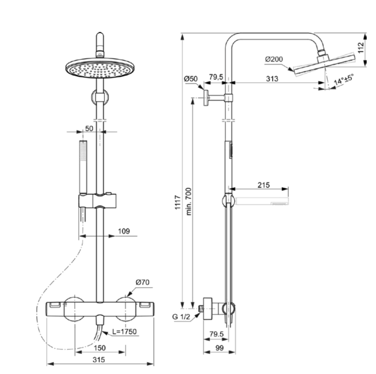 CeraTherm T25 sprchový systém s termostatickou batériou so sprchovou nástennou termostatickou batériou CeraTherm T25. DN 15. Nová termostatická kartuša s vylepšenou technológiou nastavenia a kontroly teploty vody, regulácia teploty vody a ochrana proti obareniu. Štíhlejšie telo batérie Ø 41 mm so zdokonalenou technológiou CoolBody, vďaka nej telo termostatickej batérie zostane chladné po celom povrchu. Skryté S-prípojky s nízkou hlučnosťou (nastaviteľné od 137 - 163 mm). Funkcia AntiKalk - systém proti tvorbe vodného kameňa. Hlavová sprcha ABS Ø200 mm a 1-funkčná okrúhla ručná sprcha IdealRain Ø100mm. Funkcia Anti-Kalk (proti tvorbe vodného kameňa). Sprchová tyč s posuvným držiakom sprchy. Hadice "Idealflex" 1750 mm. Skryté pripojení G1/2. Obmedzovač teplej vody - detská poistka.Regulácia teploty s ochranou proti obareniu. Kovové ovládacia rukoväte. Ľavá pre reguláciu prietoku i teploty vody, pravá so zabudovaným prepínačom, pre prepínania medzi vaňou a sprchou. V súlade s EN 1111