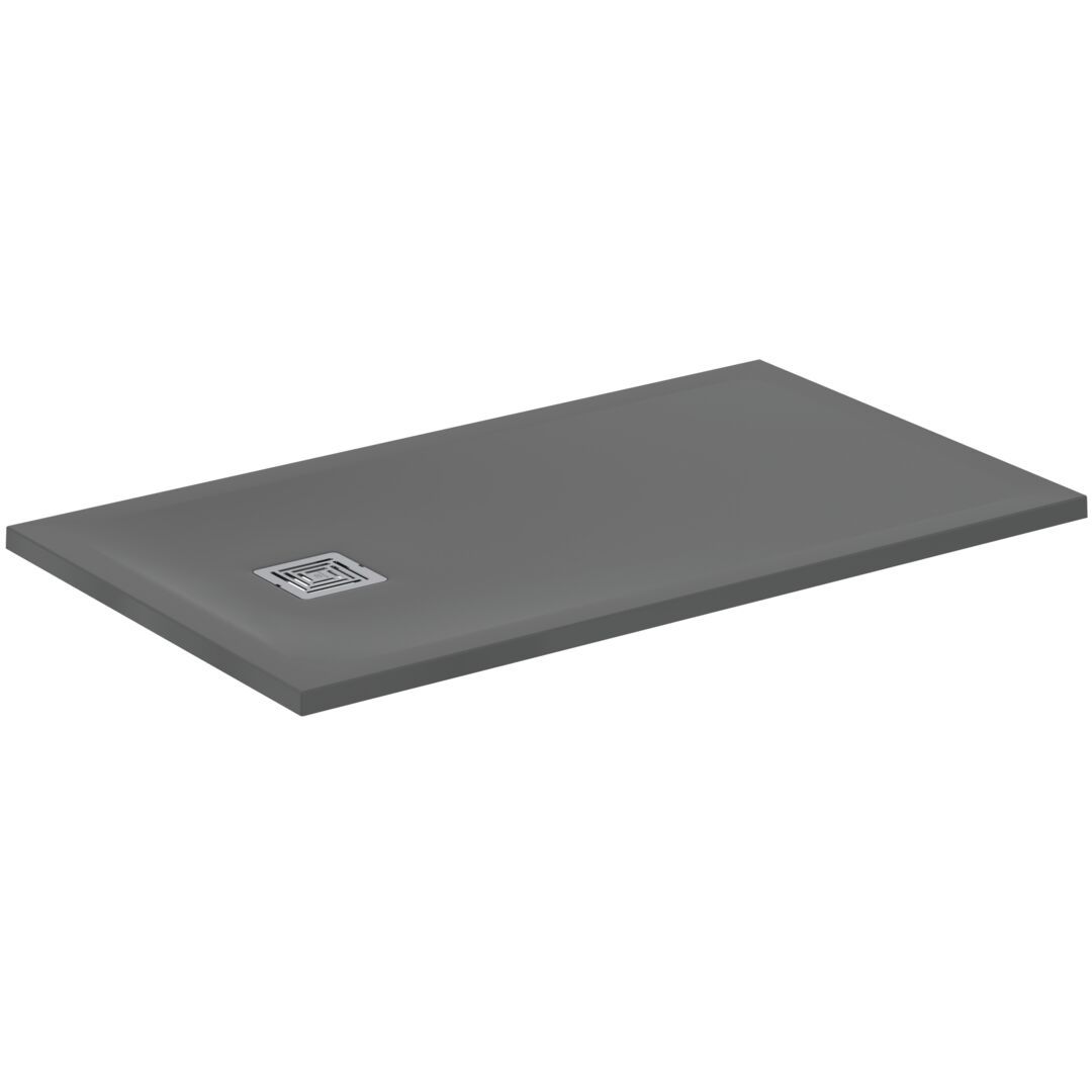 Sprchová vanička UltraFlat S + z materiálu IdealSolid farba betónovo sivá a špeciálnou povrchovou reliefnou vrstvou GelCoat. Vzhľad povrchu imituje hrubo otesaný kámeň. Protišmyk trieda C podľa normi EN 51097. Dodávané vrátene designového krytu z nerezovej oceli.